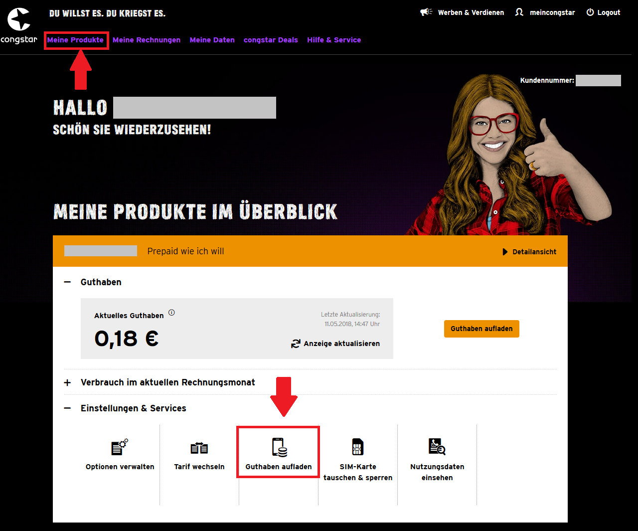 Alternativ könnt ihr auch auf "meine Produkte" und rechts neben dem gewünschten Tarif auf "Bearbeiten" und auf "Guthaben aufladen" klicken: