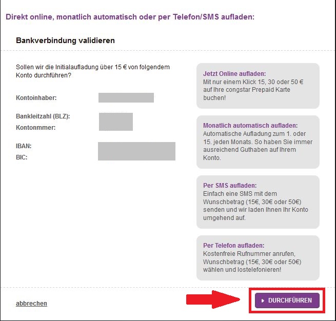 Validiert eure Bankverbindung mit einem Klick auf "durchführen":