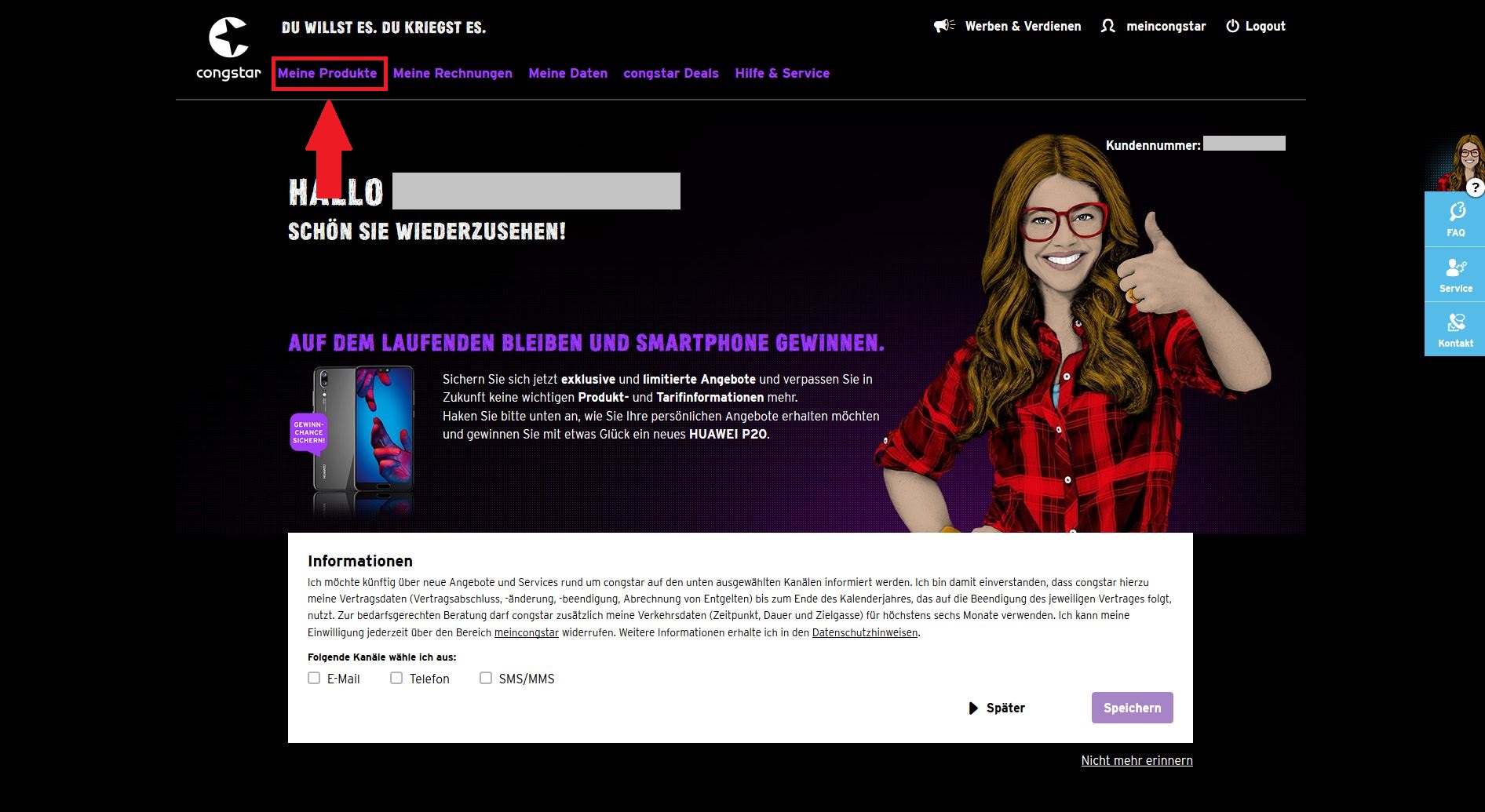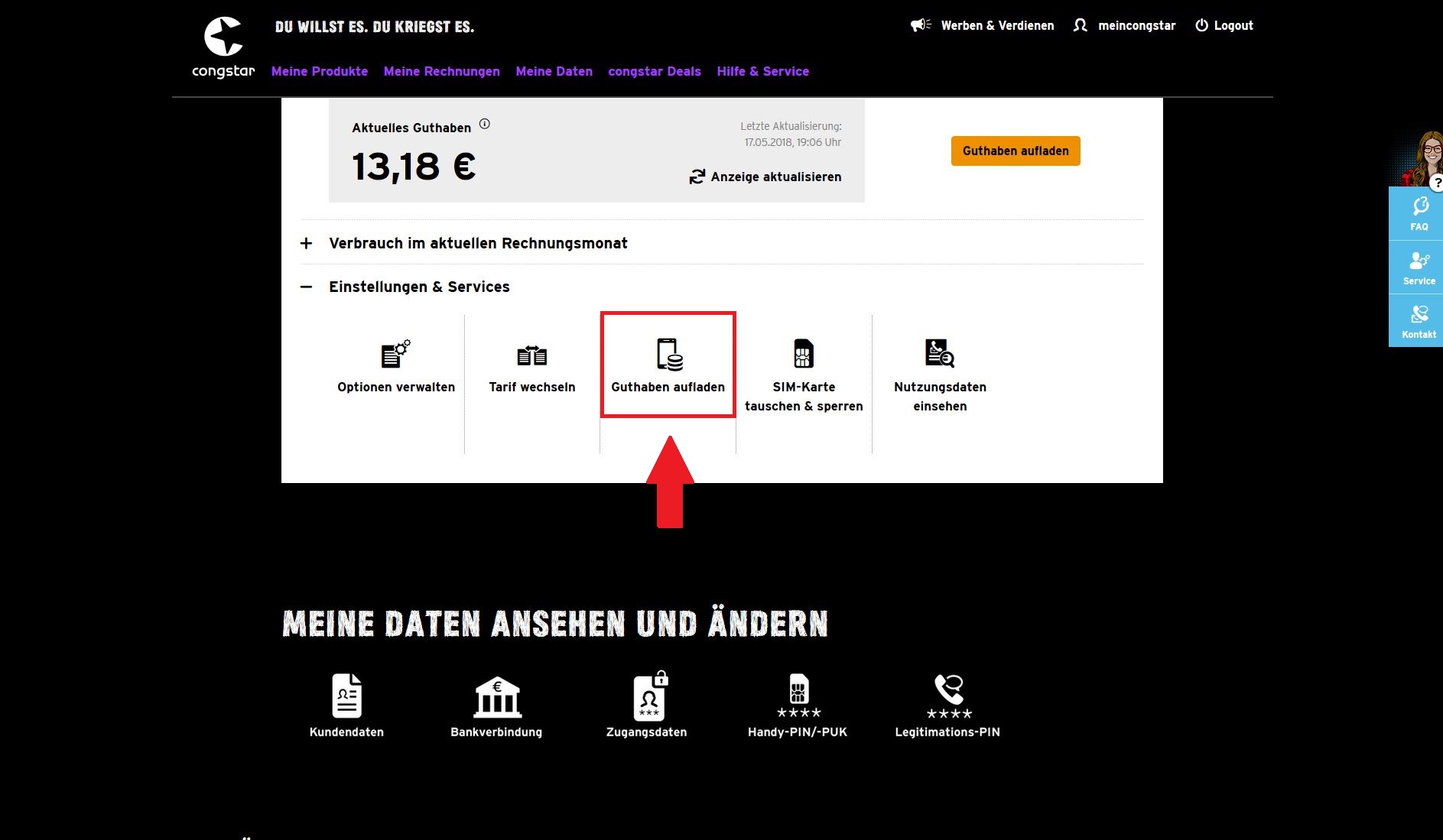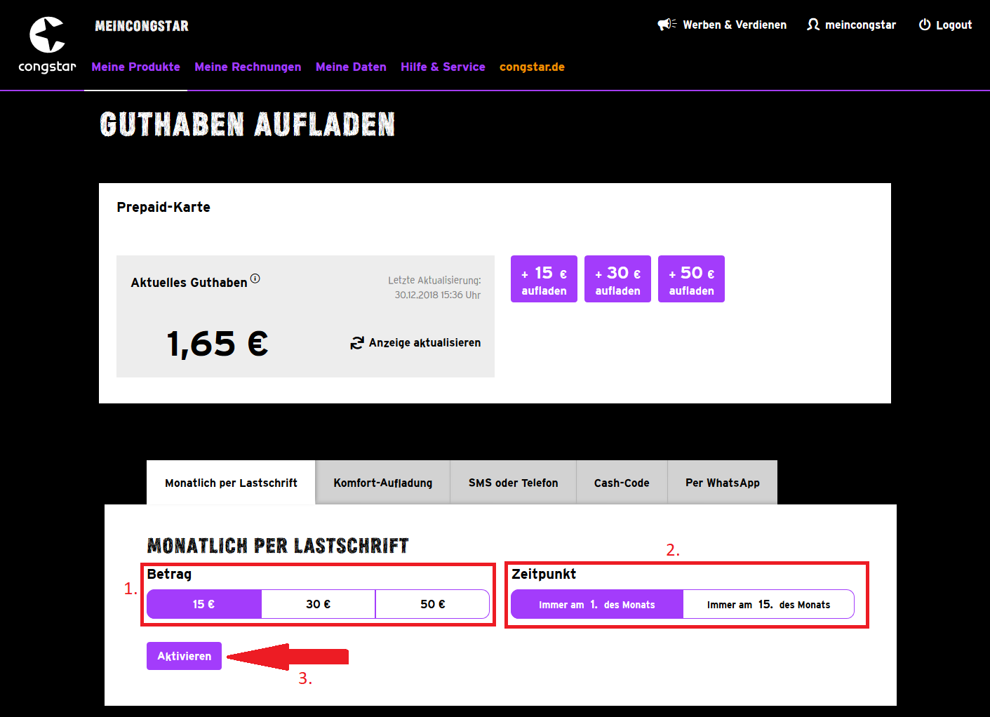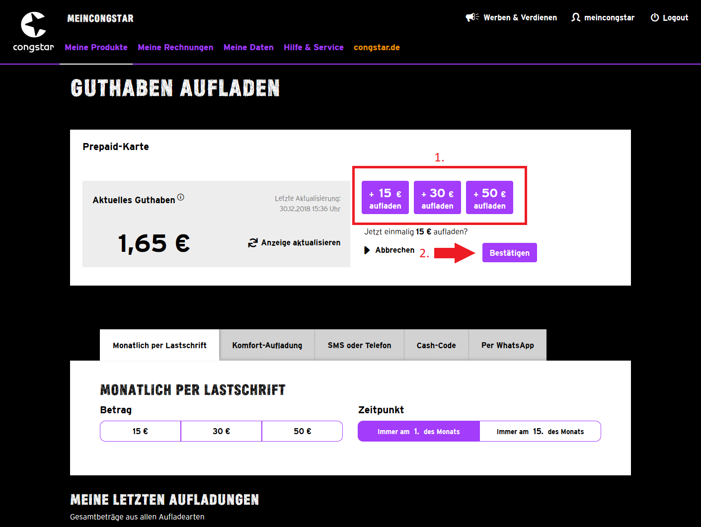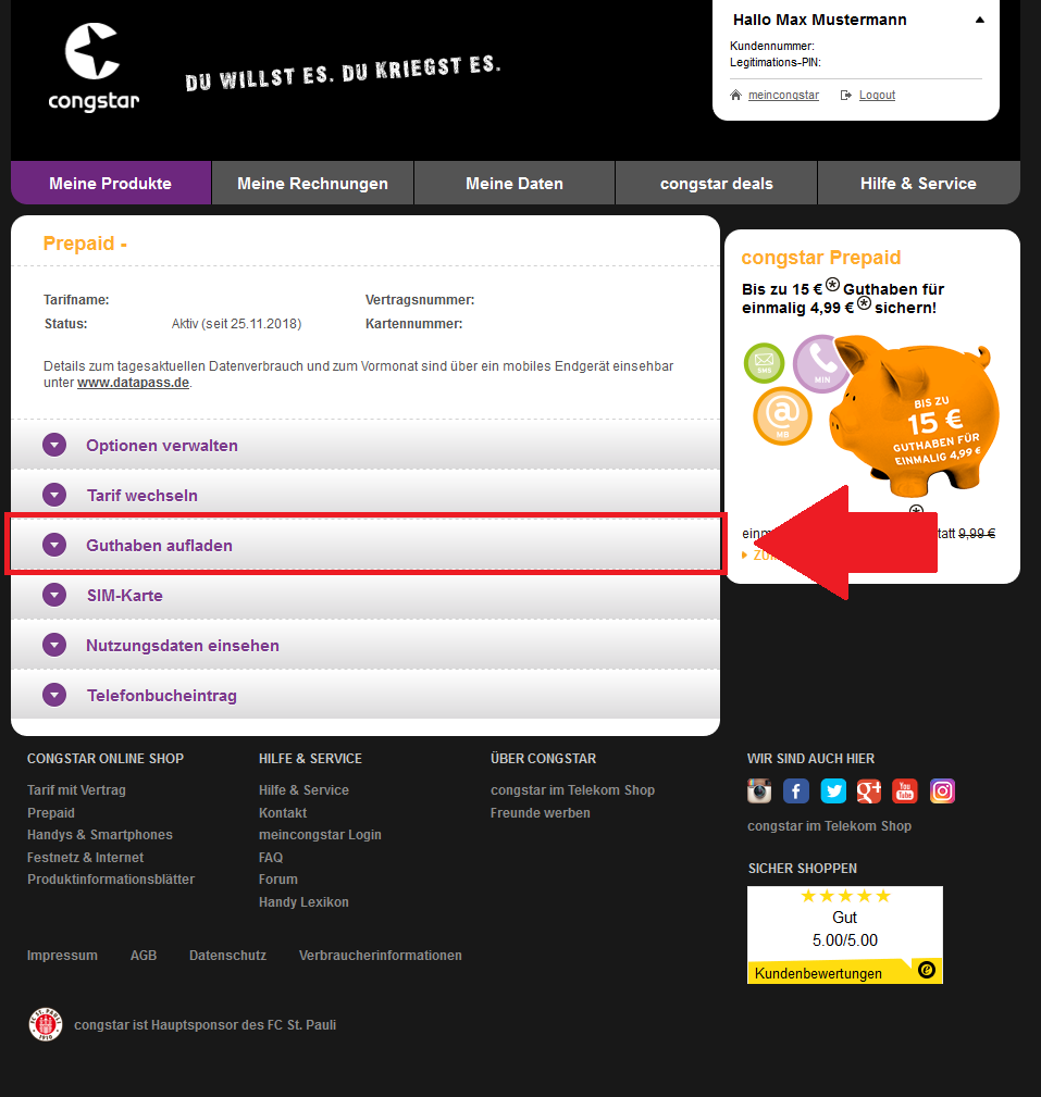 Wenn ihr die Erstaufladung (siehe oben) bereits erfolgreich durchgeführt habt, könnt Ihr jederzeit weitere Aufladungen im meincongstar Servicecenter schnell und einfach beauftragen: