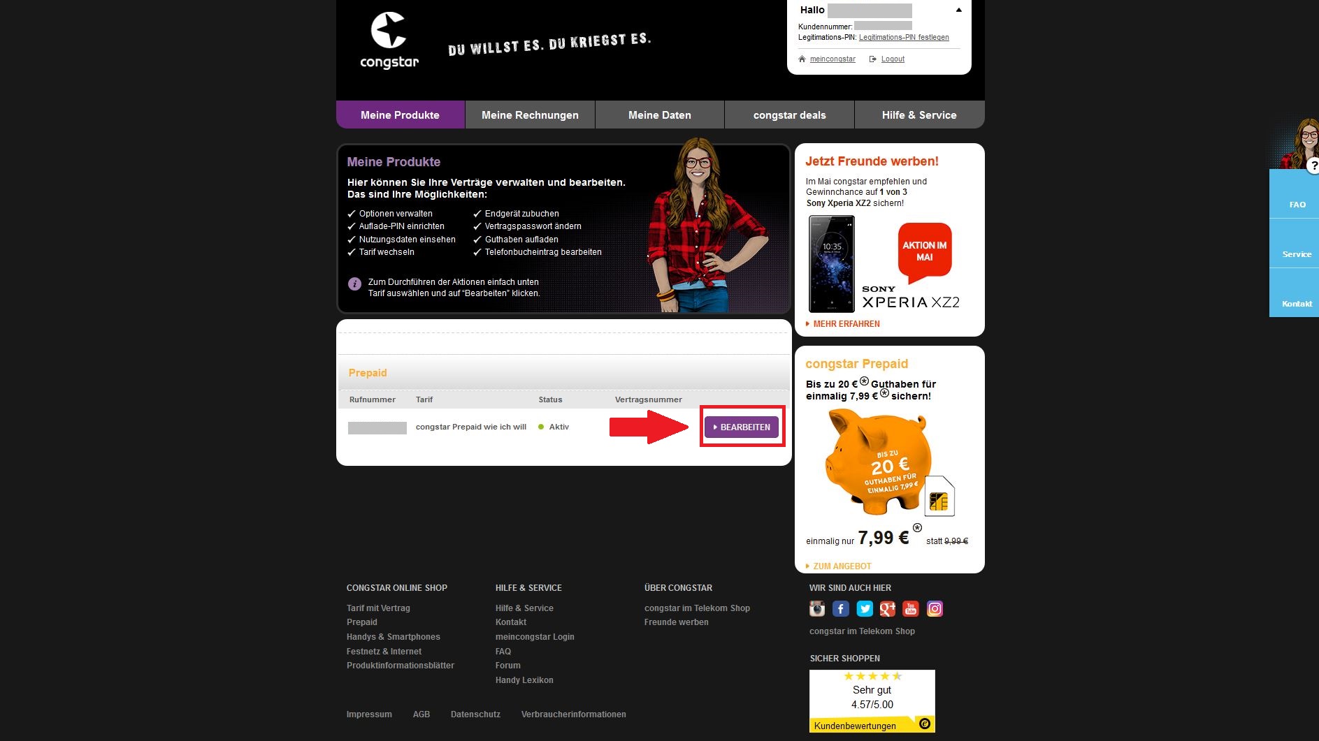 Alternativ könnt ihr auch auf "Meine Produkte" und dann neben der gewünschten Prepaid-Rufnummer auf "Bearbeiten" klicken.