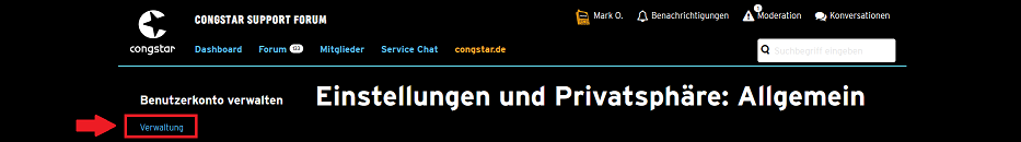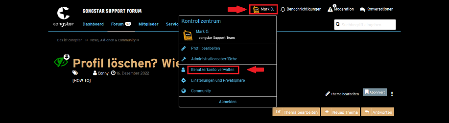 - Ihr klickt oben auf euren Foren-Namen und im Dropdown-Menü dann auf Mitgliederkonto verwalten