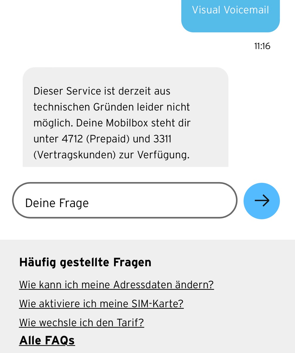 Da anscheinend nun der Fokus auf der App liegt (vgl. die Diskussion zur Einschränkung des Kundencenters auf der Website: meincongstar Kundencenter), wäre es nicht auch eine Chance, eine Mailbox in die congstar App zu integrieren - wenn es schon keinen Zugriff auf die offizielle Visual Voicemail bzw. Mailbox Pro gibt?