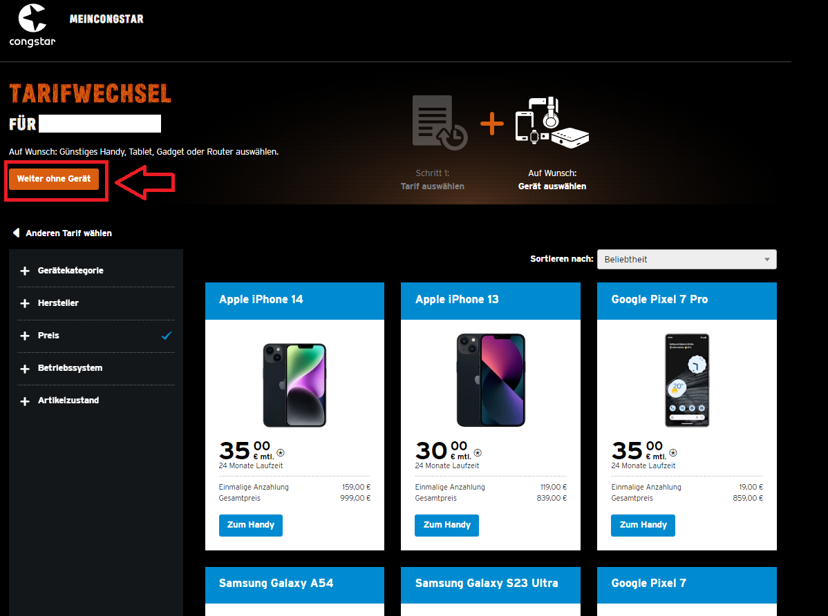 Hier könnt ihr euch entscheiden, ob ihr ein Gerät zum Tarifwechsel bestellen möchtet.