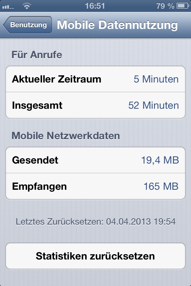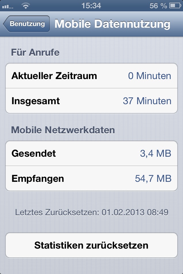 Hallo ich habe ein Problem und zwar haben wir heute den 09.02.13 und am 01.02.13 habe ich auf meinem iPhone die Mobile Datennutzung zurückgesetzt und heute bekomme ich eine SMS "Sie haben ihr Datenvolumen überschritten" aber ich habe bei mir 54,6 mb Empfangen und 3,4 mb Gesendet stehen warum habe ich eine Datenvolumen Drosslung ?