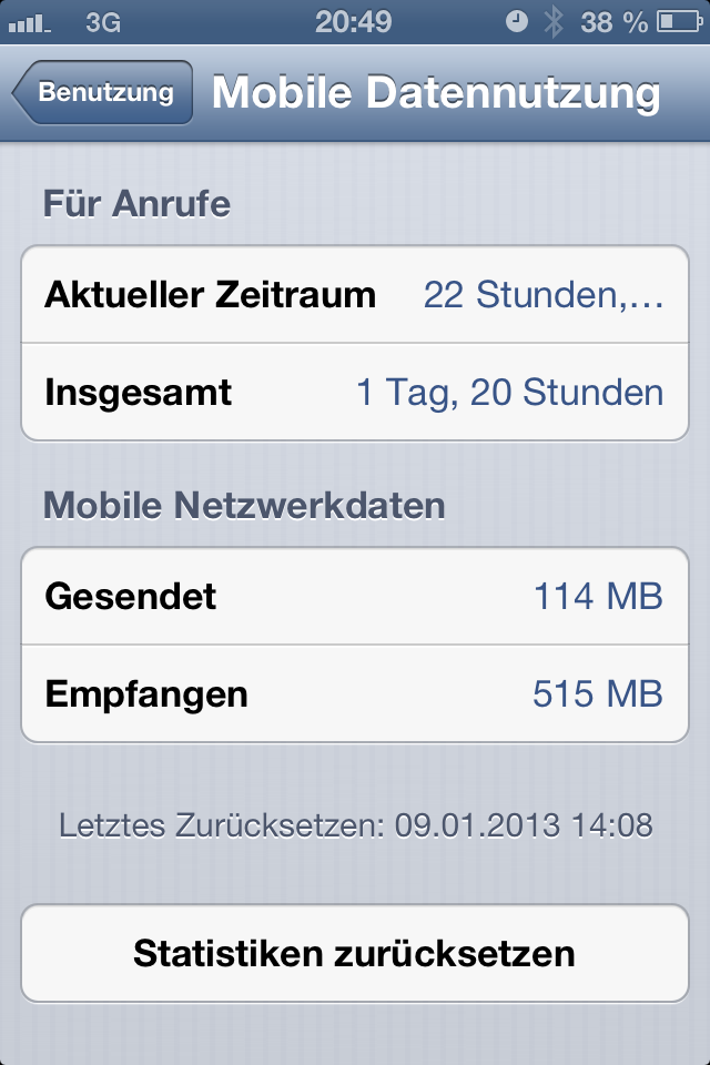 Mein iPhone zeigt mir völlig korrekt an dass seit der letzten Zurücksetzung 500 Mb heruntergeladen wurde, allerdings in ca. 2 Monaten.