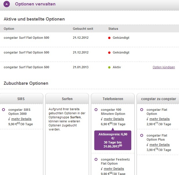 Zur Dokumentation noch ein Screenshot aus "mein Congstar" und der aktivierten Congstar Surf Flat 500.