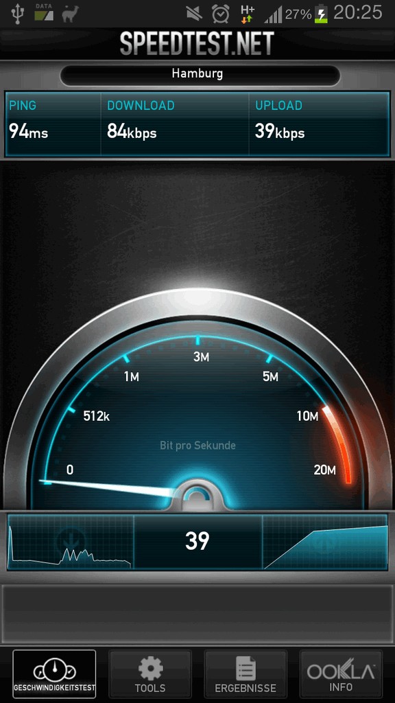 Obwohl mein HTC One H+, also HSPA+, anzeigt komme ich beim Speedtest auf: