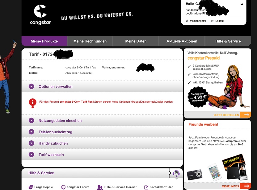 Allerdings wird mir bei "Optionen verwalten" ebenfalls angezeigt: Für das Produkt congstar 9 Cent Tarif flex können derzeit keine Optionen hinzugefügt oder gekündigt werden.