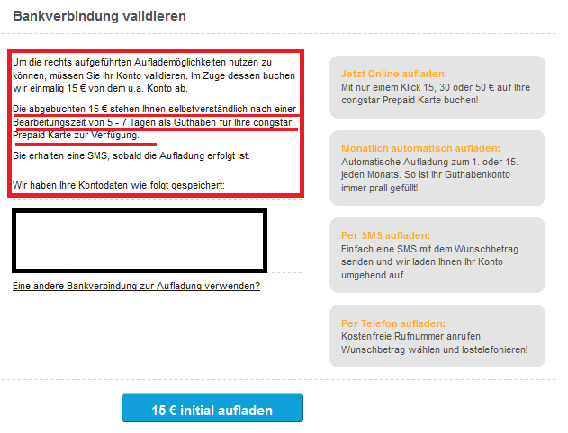 Der Mobilfunkanbieter muss erst das ok geben, dann wird es abgebucht. So also Congstar hat es mal wieder verkackt, ich habe immernoch kein Guthaben und zusätzlich habe ich jetzt bald unnötige 30€ Guthaben, obwohl ich eigentlich nur 15€ brauche, aber alles braucht ja bei Congstar solange.