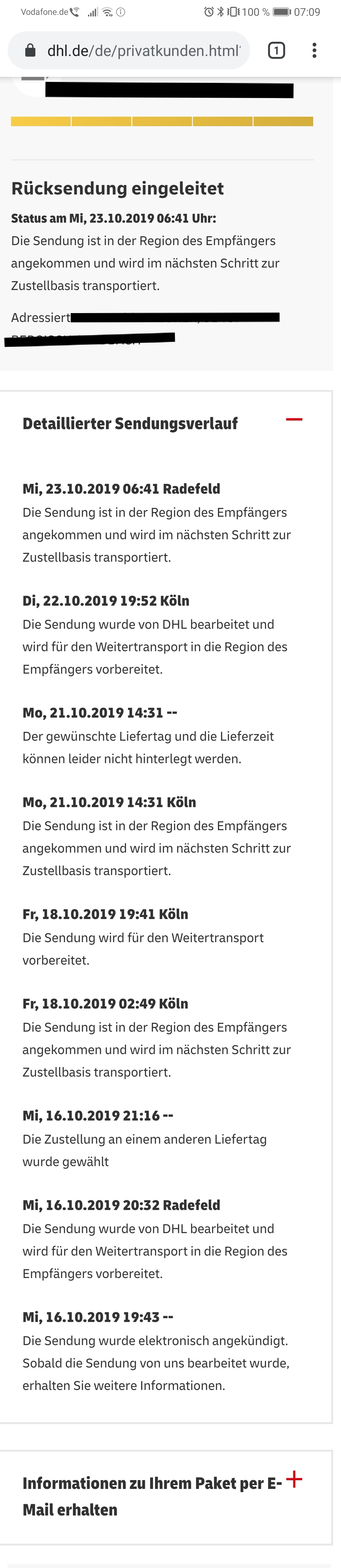 Jetzt ist der Sendungsstatus aktualisiert, nämlich, dass die Sendung wegen fehlender erforderlicher Daten zurückgeschickt wird. Ich fühle mich wirklich von euch verschaukelt.