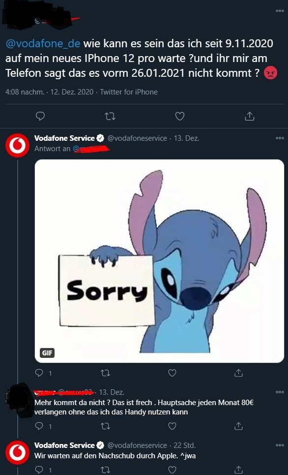 Im Übrigen unterstütze ich voll die bereits mehrfach getroffenen Aussagen, dass die Servicemitarbeiter da am wenigsten für können und auch nur die Infos weitergeben können über die sie selbst verfügen. Und wenn ein Mitarbeiter den Kunden derart abwimmelt mit einer Flunkerei, würde ich nicht direkt im Mitarbeiter einen schlechten Menschen sehen, sondern mich bei den vorherigen Anrufern bedanken die ihm von Kundenseite aus zugesetzt haben weil sie vielleicht kein Verständnis für die Situation haben und in dem Mitarbeiter ihr Ventil gesehen haben.