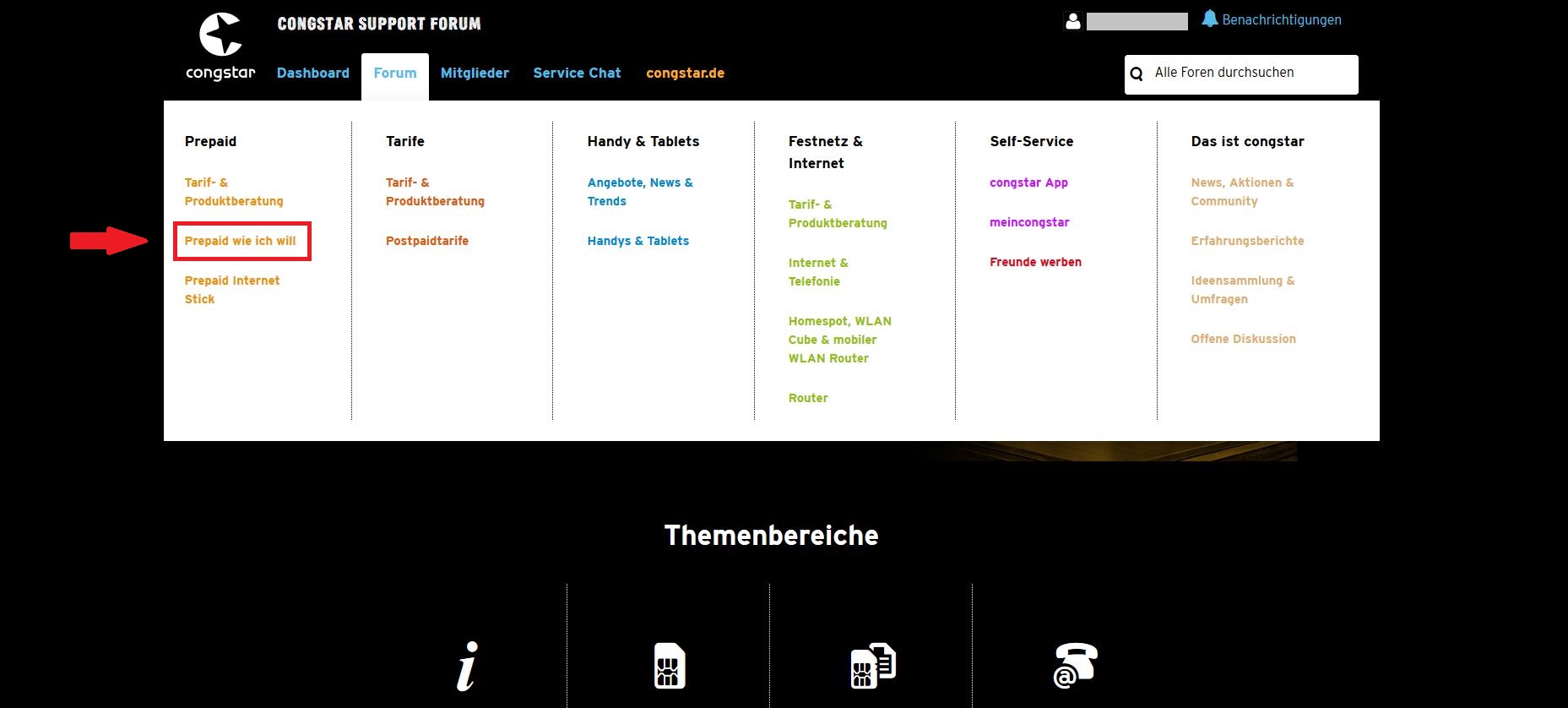 Wenn ihr eine Frage zum Prepaid wie ich will Tarif habt oder wissen möchtet, wie ihre eure Prepaid Optionen ändern könnt, ist das Board "Prepaid wie ich will" die richtige Wahl. Zieht einfach mit der Maus oben über "Forum" und klickt dann auf "Prepaid wie ich will":