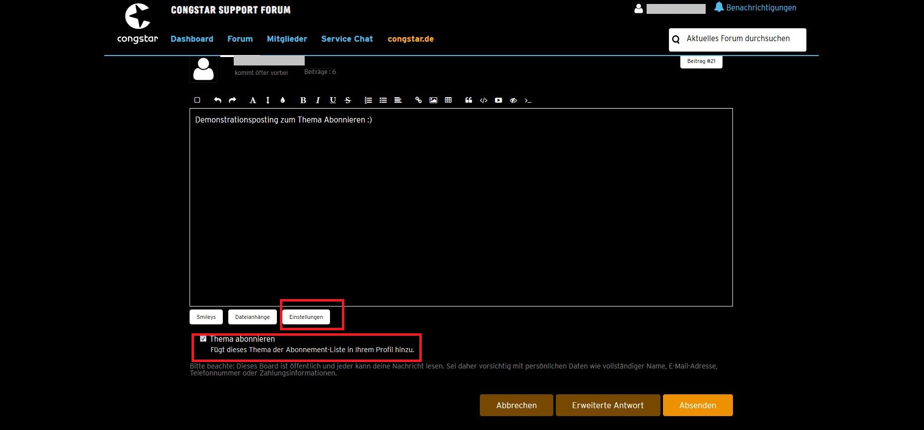 Wenn ihr eure Frage stellt, abonniert ihr automatisch das erstellte Thema. Wenn ihr das nicht möchtet, klickt bitte unter dem Eingabefeld auf "Einstellungen" und entfernt bei "Thema Abonnieren" den Haken: