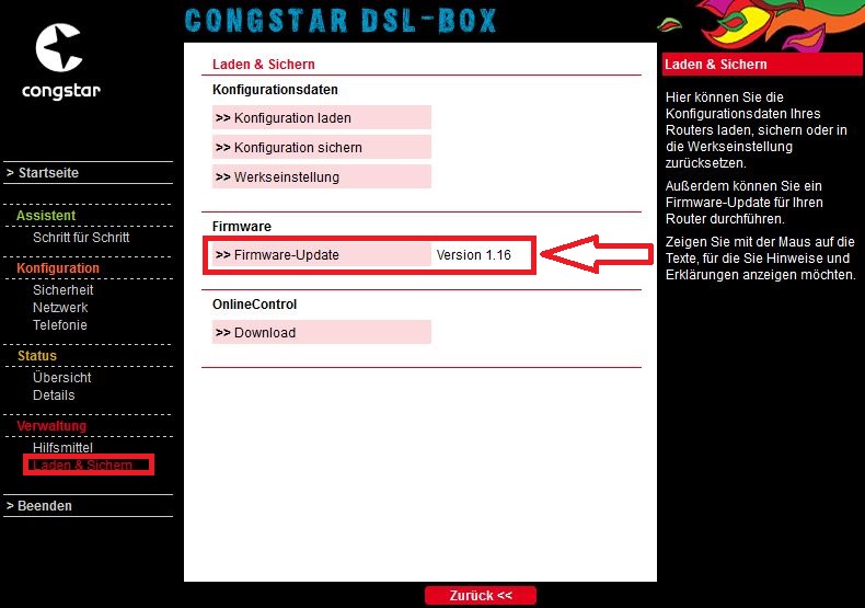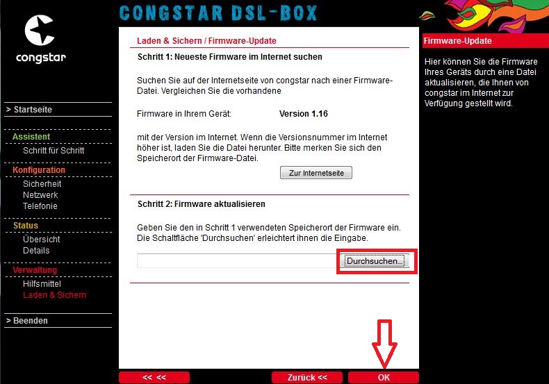 Um die neue Firmware aufzuspielen, öffnet bitte im Browser die Routeroberfläche, indem Ihr congstar.box in die Adresszeile eingebt