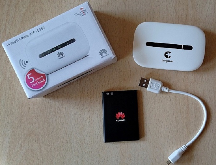 Den mobilen congstar W-Lan Router (Technischer Name: Huawei e5330Bs-2) findet man in einem kleinen Karton gut verpackt. Der Router kann mit bis zu 10 W-LAN fähigen Geräten verbunden werden. Die Stromversorgung und Ladung des Akkus erfolgt über USB.