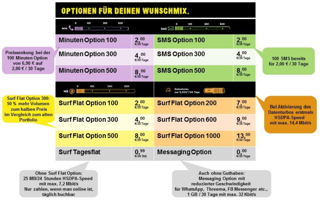 Ganz neu ist die Messaging Option mit reduzierter Geschwindigkeit von max. 32 Kbit/s und 1 GB / 30 Tage Datenvolumen für 0 € / 30 Tage. Sie ermöglicht auch ohne Guthaben die Nutzung von Diensten wie WhatsApp, Threema und Facebook Messenger, auch wenn keine kostenpflichtige Datenoption aktiviert ist.
