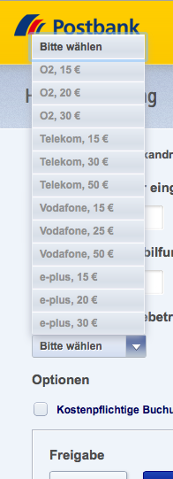 Wegen der Aufladeoptionen bin ich jetzt etwas überfragt. Klar, ich könnte dies automatisch geschehen lassen in dem ich mein Konto validiere, aber mir fiel auf, dass ich im Onlinebanking der Postbank ja auch Karten aufladen kann. (siehe beigefügter Screenshot) Die Option Telekom sollte doch in dem Falle funktionieren, oder? Die Netzrecherche war da nicht 100% eindeutig.