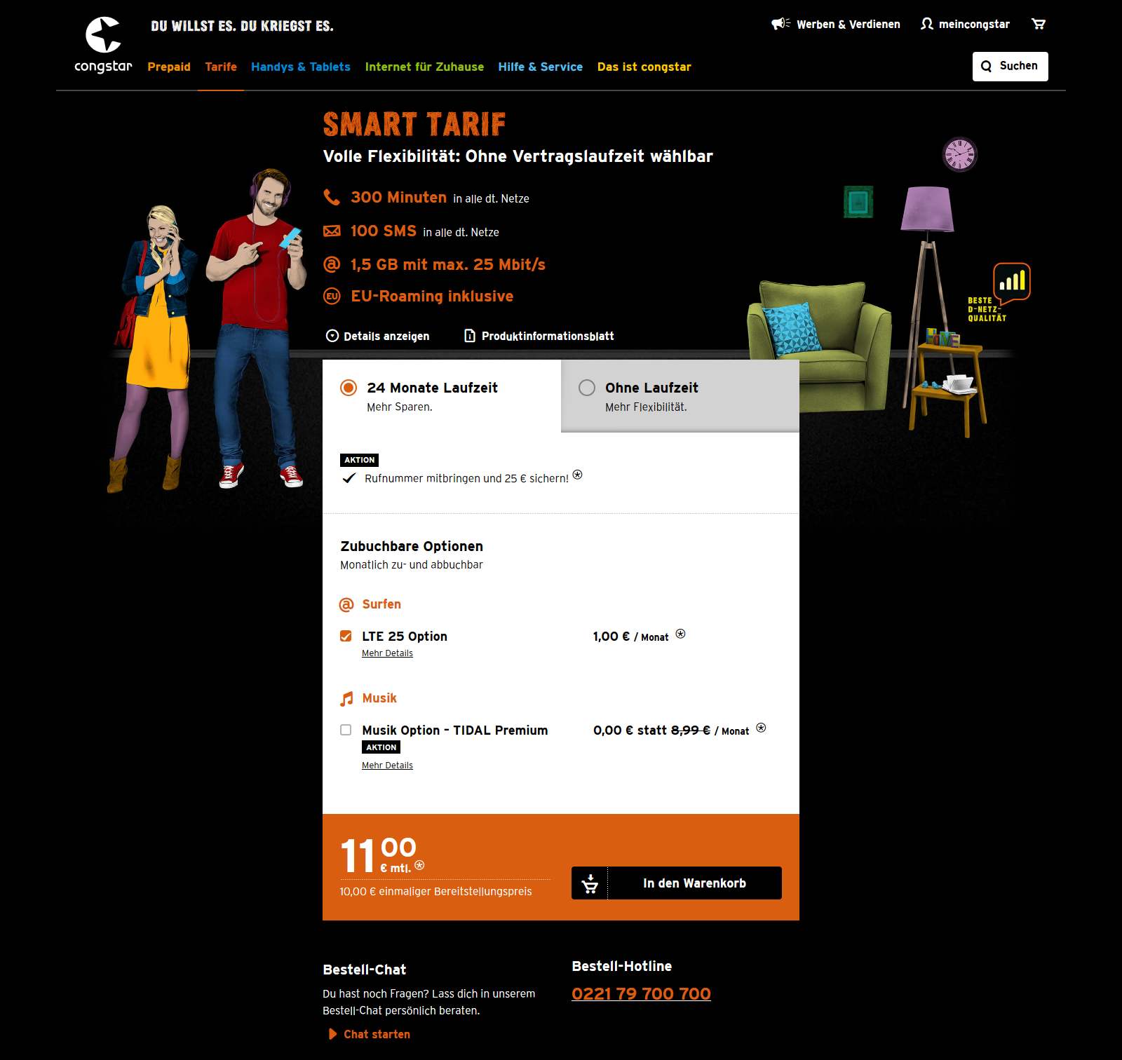 Als erstes wählt ihr euren Wunschtarif und entscheidet, ob ihr einen Vertrag mit 24 Monaten Laufzeit bestellen möchtet oder ob der Vertrag als Flex-Tarif monatlich kündbar sein soll.