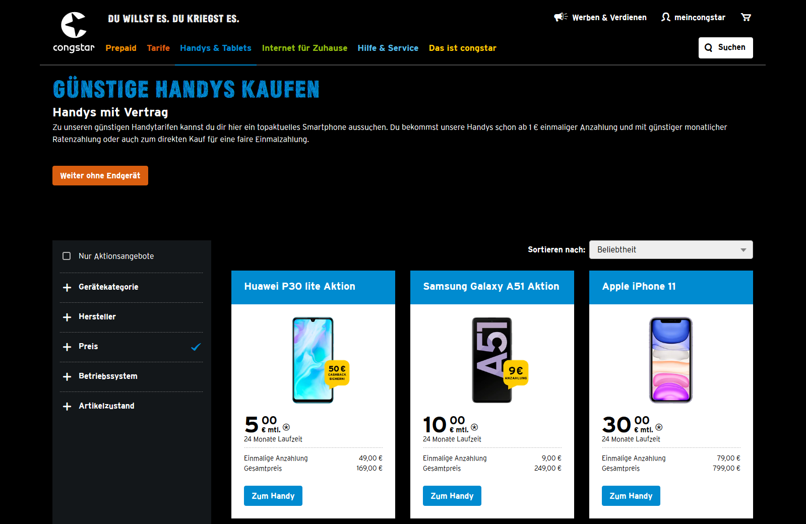 Danach könnt ihr ein zum Tarif passendes Smartphone wählen und ebenfalls in den Warenkorb befördern.