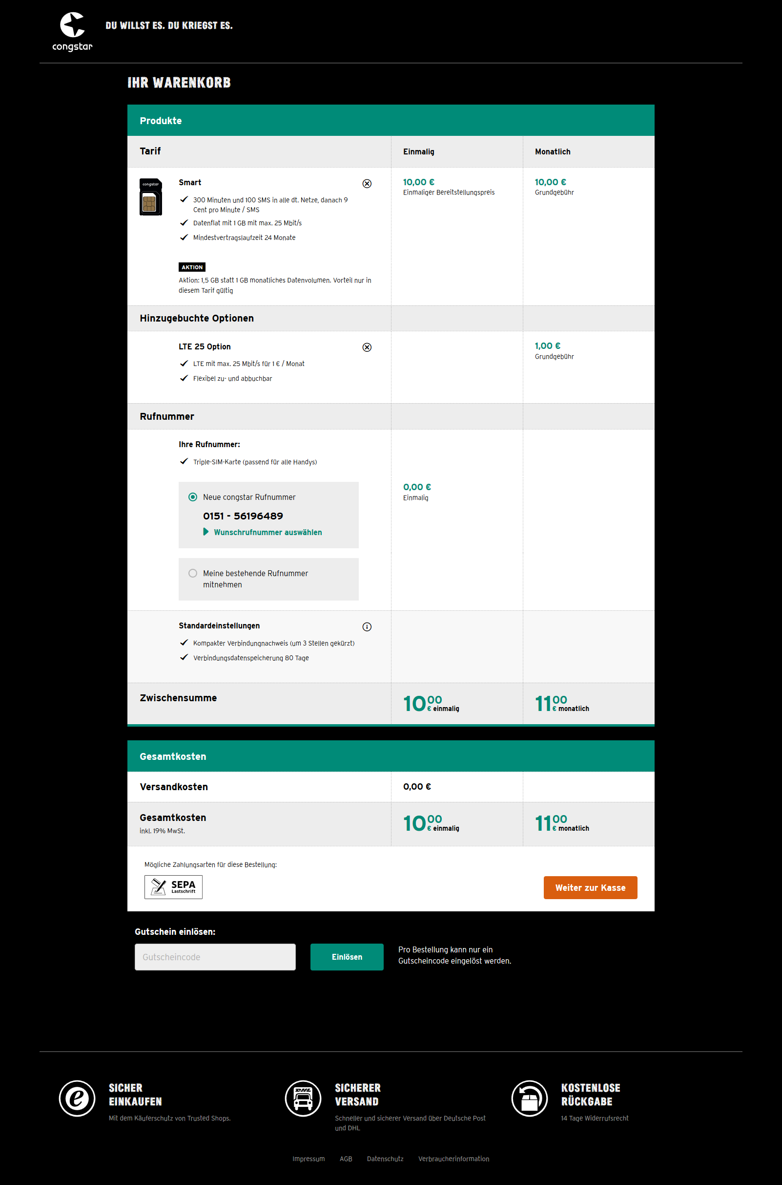 Im nächsten Schritt seht ihr euren Warenkorb. Hier habt ihr auch die Möglichkeit, eine Rufnummer auszuwählen. Dabei könnt ihr