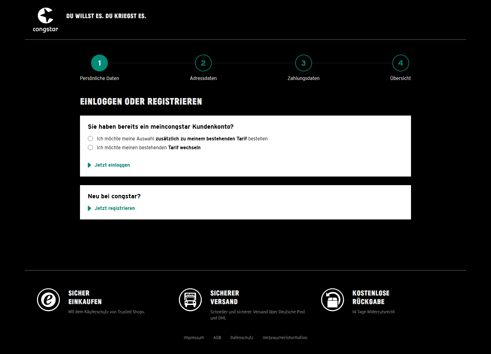 Wenn ihr schon länger bei uns seid, wählt ihr, ob ein zusätzlicher Tarif bestellt, oder ein bestehender Tarif gewechselt werden soll. Mit "Jetzt einloggen" geht es weiter. Werft am besten einen kurzen Blick auf die Daten, ob Adresse etc. noch aktuell sind.
