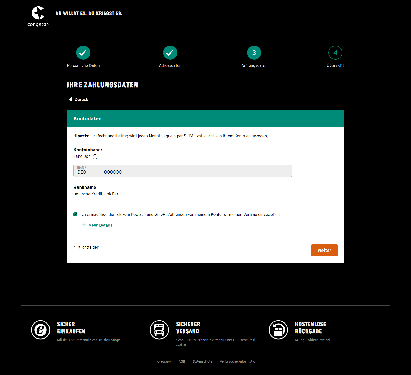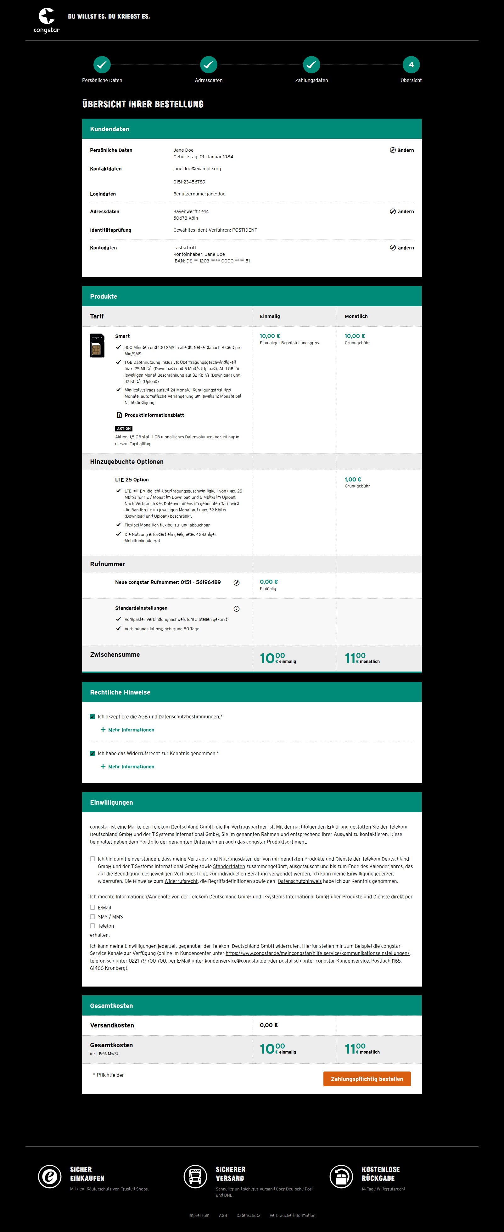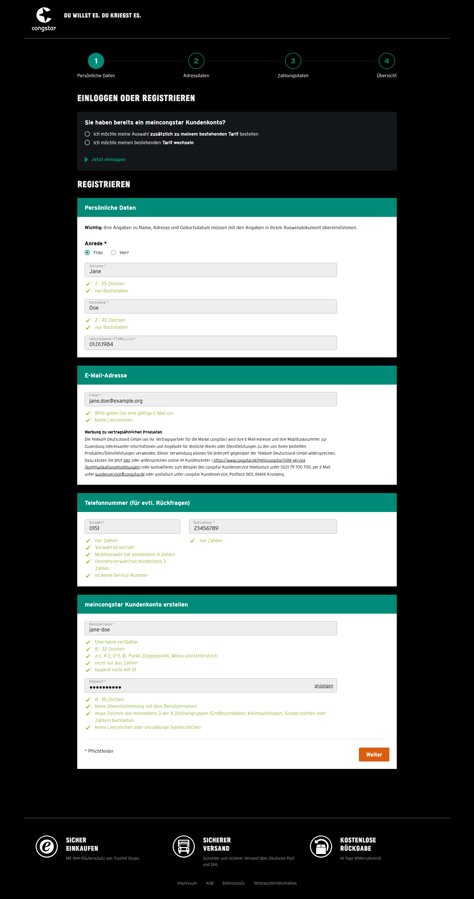 Wenn ihr neu bei uns seid, tragt ihr eure Daten wie in unserem Beispiel ein und erstellt damit direkt ein congstar Konto.