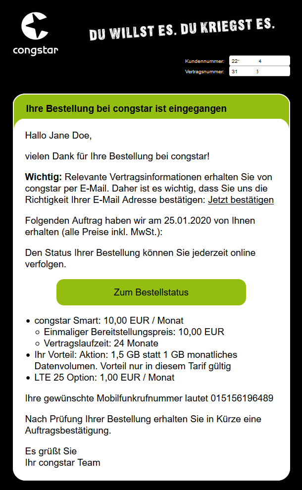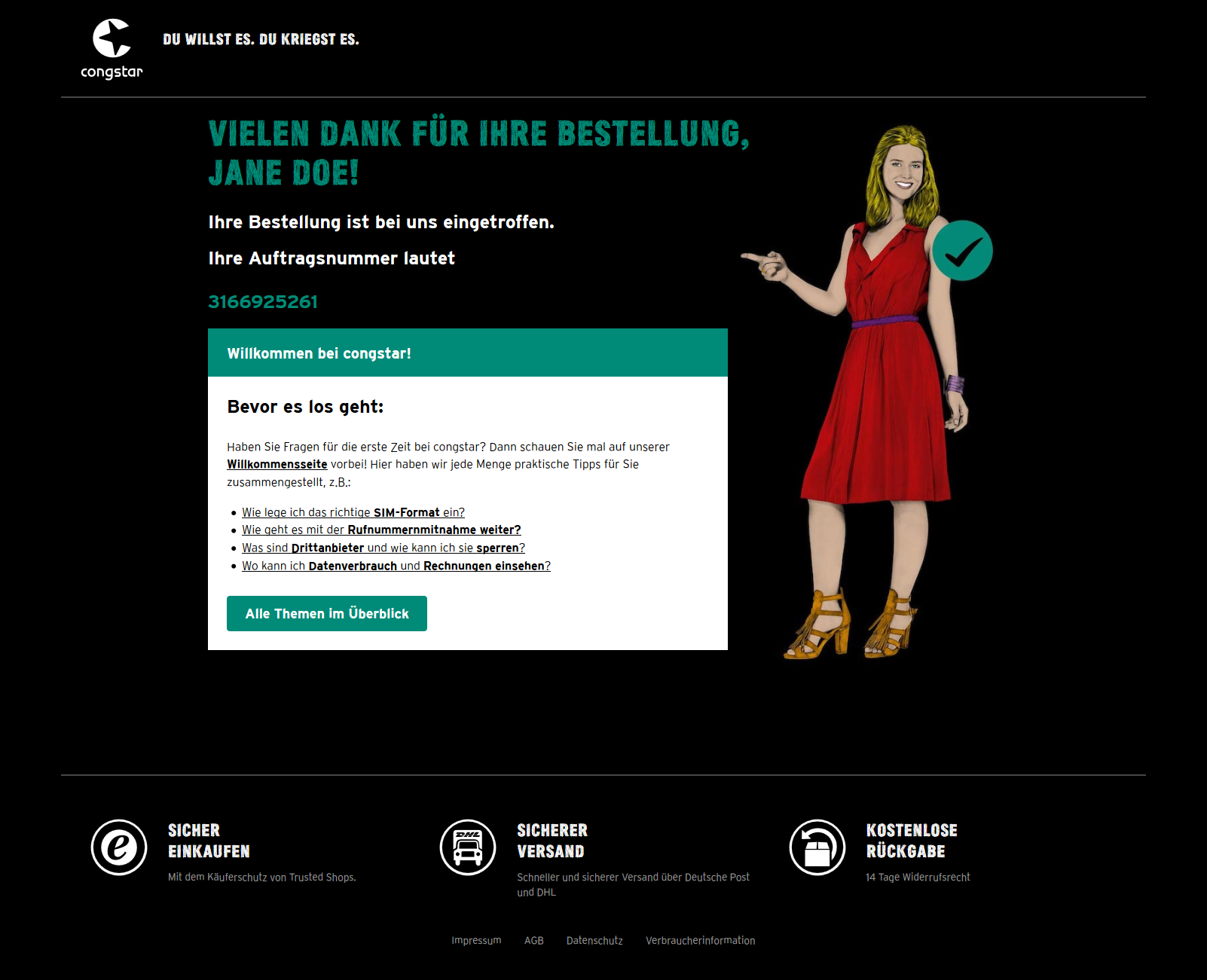 Wenige Momente später erhaltet ihr eine Bestätigung von uns per E-Mail. Willkommen bei congstar!