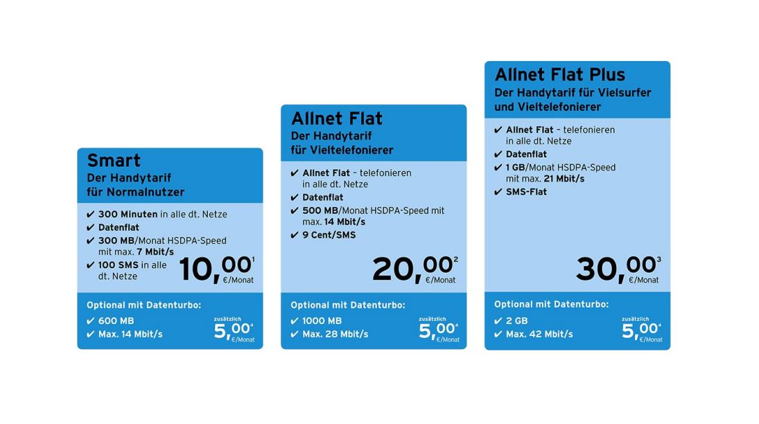 Die neue Allnet Flat Plus für 30 Euro im Monat bietet neben einer Allnet Flat zum Telefonieren in alle deutschen Netze auch eine SMS Flat sowie 1 GB Datenvolumen mit max. 21 Mbit/s. Mit Datenturbo für zusätzlich 5 Euro monatlich stehen hier sogar 2 GB Datenvolumen und bis zu 42 Mbit/s Surfgeschwindigkeit zur Verfügung. Ein Wechsel zwischen den neuen Tarifpaketen ist auf Wunsch kostenlos möglich. Auch Bestandskunden können kostenlos in die neuen Tarife wechseln.