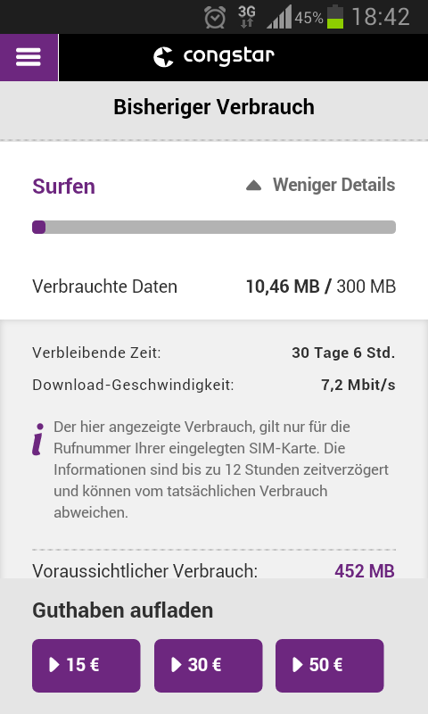 um auf meinem neuen Samsung Galaxy S3 neo das verbrauchte Datenvolumen meines Prepaid-Vertrags zu sehen, habe ich versucht, mich in der meincongstar-App einzuloggen. Obwohl das WLan ausgeschaltet ist und Benutzername/Passwort richtig eingegeben werden, schlägt das Login fehl, und das schon wiederholt. Es erscheint folgende Meldung: "Entweder ist Ihre Datenverbindung zu langsam oder Sie haben kein Datenvolumen mehr frei. Ersteres ist in Nürnberg unwahrscheinlich (zumal die Abfrage des Kontostands mit *100# einwandfrei funktioniert), Letzteres ist Unsinn, denn die Anzeige kommt bei einem Bekannten mit dem gleichen Gerät auch bei verbrauchtem Datenvolumen. Hat jemand eine Idee, was da los ist?