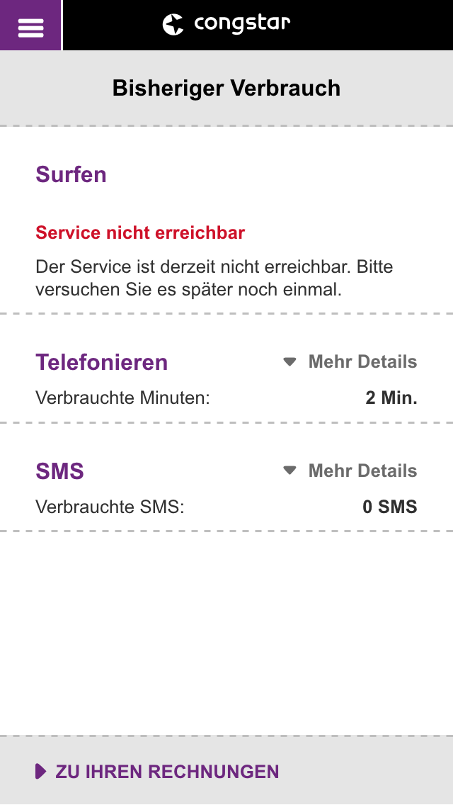 • wie auch schon an anderer Stelle in diesem Forum beschrieben, wird seit dem update der meinCongstar app (iOS) das aktuell verbrauchte Datenvolumen nicht mehr angezeigt, statt dessen die Meldung'Service nicht erreichbar'.