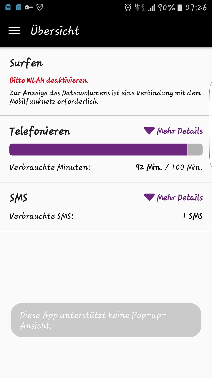 Jedoch das nächste Problem - ich kann mein verbrauchtes Datenvolumen nicht sehen, da ich folgende Meldung bekomme, OBWOHL ich das WLAN deaktiviert habe !?!?!?!