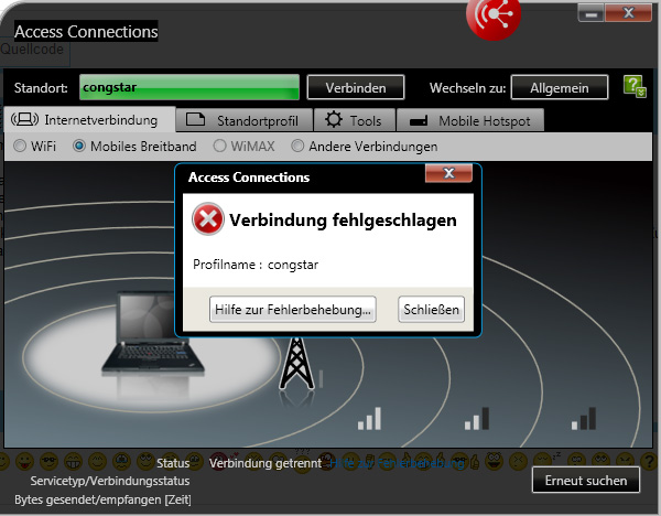 Klicke ich auf diesen Funkmast und möchte verbinden, dauert es einen Moment und es folgt die Fehlermeldung, dass die APN Einstellungen verkehrt sein. Die bezieht das Programm aber automatisch vom Provider.