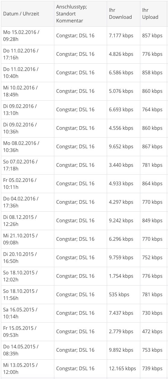 Der Zustand ist so für mich absolut nicht tragbar - zum einen, da ich viel von zuhause aus arbeiten muss, zum anderen dass es rein aus Prinzip für mich nicht nachvollziehbar ist, wieso es Congstar weder möglich ist stabiles, noch zumindest einigermaßen schnelles Internet zu liefern. Ich bezahle hier konstant für einen DSL16k Anschluss und fühle mich 10 Jahre zurückversetzt...