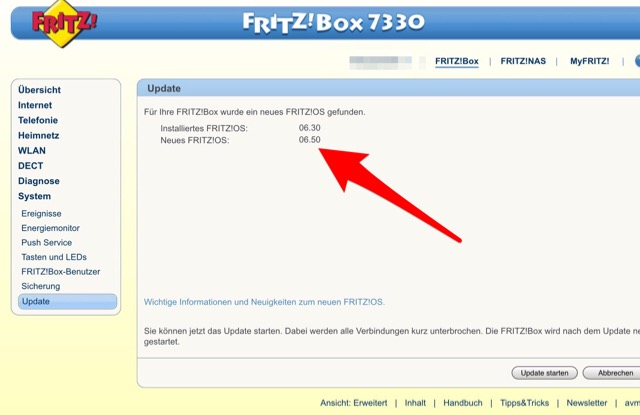 Fritzbox 7330 Firmwareupdate auf 6.50