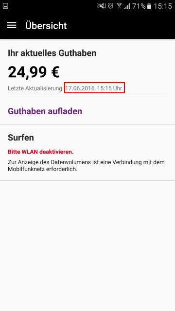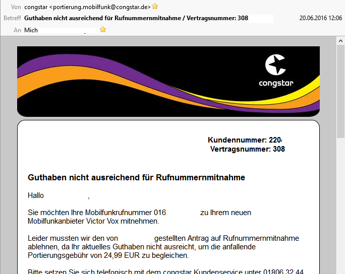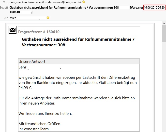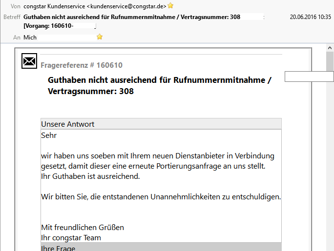 Zuerst schicke ich euch eine Verzichtserklärung und behelfsweise eine Kündigung, damit ich meine Nummer mitnehmen kann. Akzeptiert und bestätigt wird die Kündigung zum 9.6.2016. Ich schaue auf mein Guthaben, 23 Euro irgendwas. Mist. reicht nicht für die Portierungsgebühr. Also 15 Euro aufgeladen. Geschaut, Guthaben 38 Euro irgendwas. Das reicht.