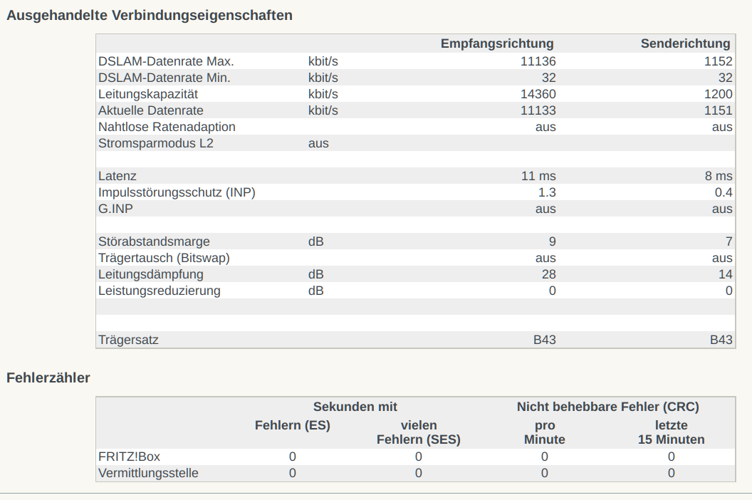 Synchronisiert wird immer mit der höchstmöglichen Geschwindigkeit (ca. 11MBit/s). Signal/Rausch-Verhältnis und Dämpfung sehen ok aus. Wenn ich in der Fritzbox unter Störsicherheit alles auf "maximale Stabilität" stelle, ändert sich an den Unterbrechungen überhaupt nichts. Nur die Verbindungsgeschwindigkeit sinkt natürlich.