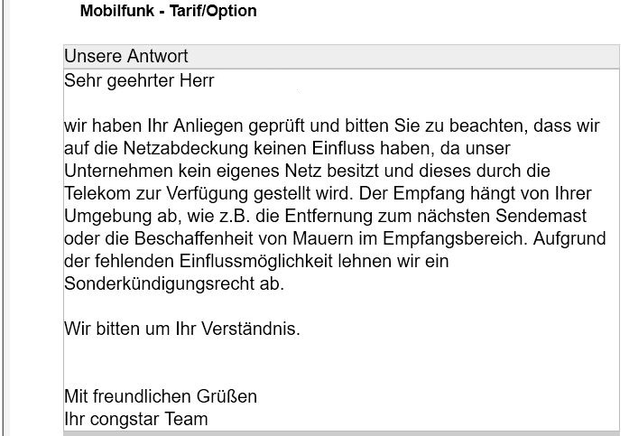Die Möglichkeit über das Kontakformular hab ich genutzt in Form einer höflichen Anfrage ob die Möglichkeit einer vorzeitigen Vertragsauflösung besteht. Es kam eine höfliche Ablehnung. Die Begründung fürden schlechten Empfang find ich schon etwas makaber. Die Mitarbeiter wissen sicherlich wieso der Empfang miserabel ist. Dürfen sich darüber aber sicher nicht äußern. Warum sollte Congstar auch zustimmen. Für die Netzabdeckung ist die Telekom verantwortlich...und die schweigt auf Nachfrage.
