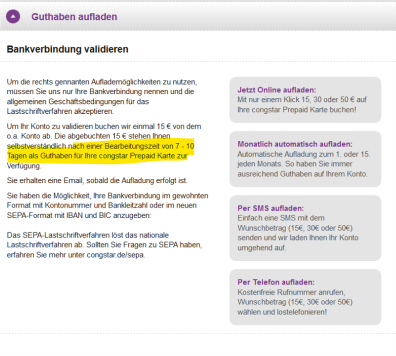 vor einer Woche habe ich eine Aufladung meines Guthabens über meinCongstar beauftragt. Augenscheinlich ganz einfach, Abbuchung per Lastschrift, Sepa Mandat habt ihr ja schon. Leider warte ich seitdem auf die Aufladung. Es erschien ein kurzer Hinweis, dass meine Bankverbindung überprüft würde. Aber das habt ihr doch schon im Rahmen des Kaufs der SIM Karte?