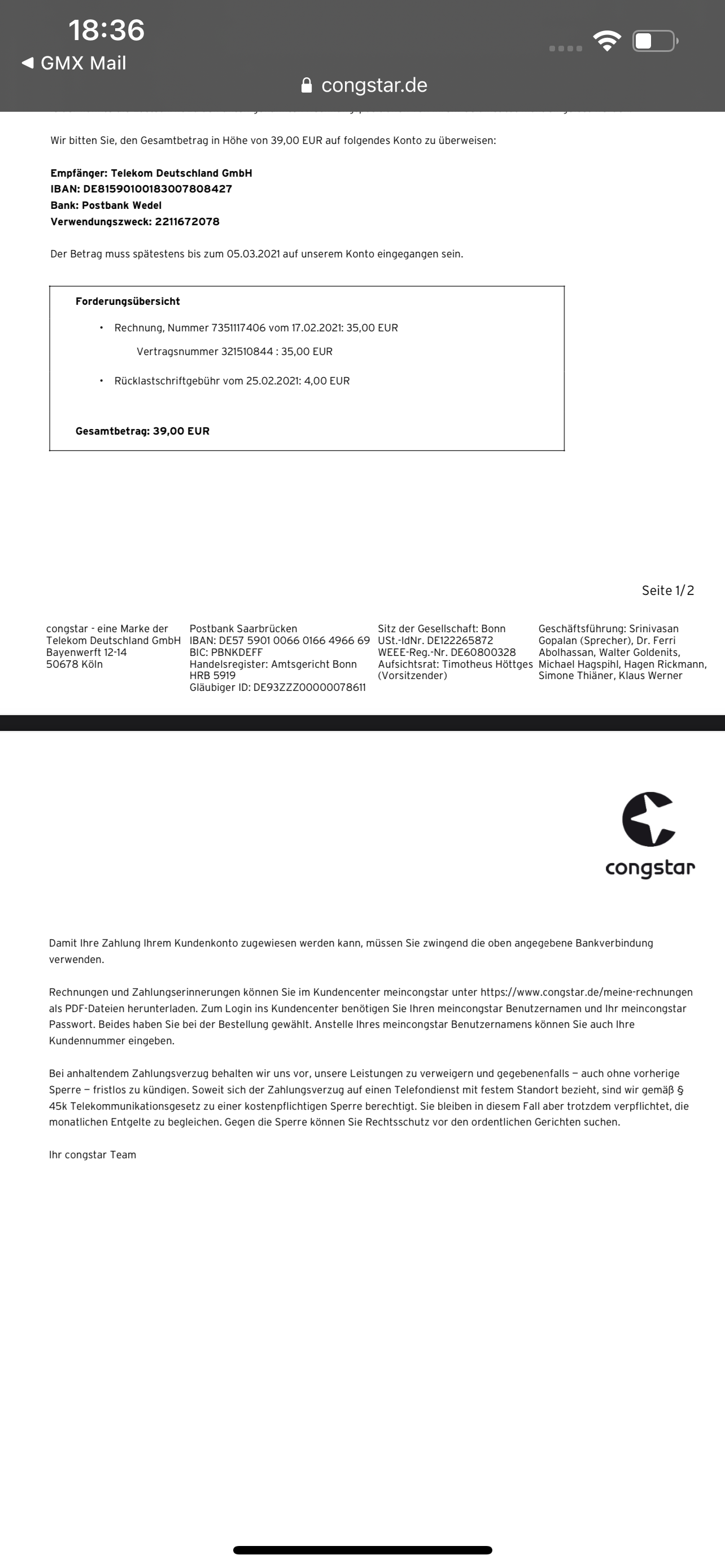 Mahnung 186 Euro , wurde mir mehrfach seitens congstar versichert, das dies , mit der Anzahlung verechnet wird . Service Chat sagte das geht net , dann kam eine email es ginge wohl doch , es wäre 70.24 Euro offen . Also auch angewiesen um den offenen Beitrag zu begleichen .