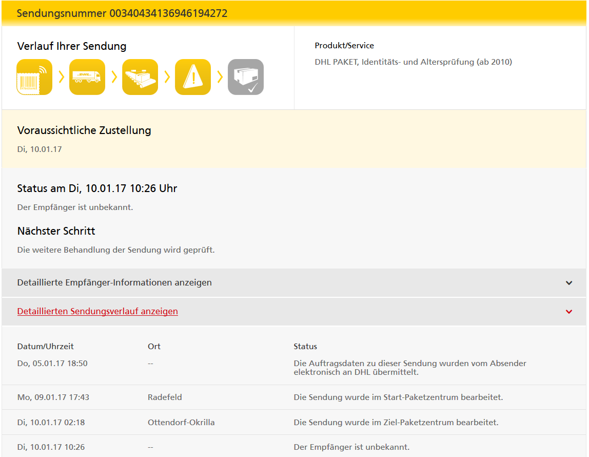 Dem folgte heute die nächste Überraschung: "Der Empfänger ist unbekannt."