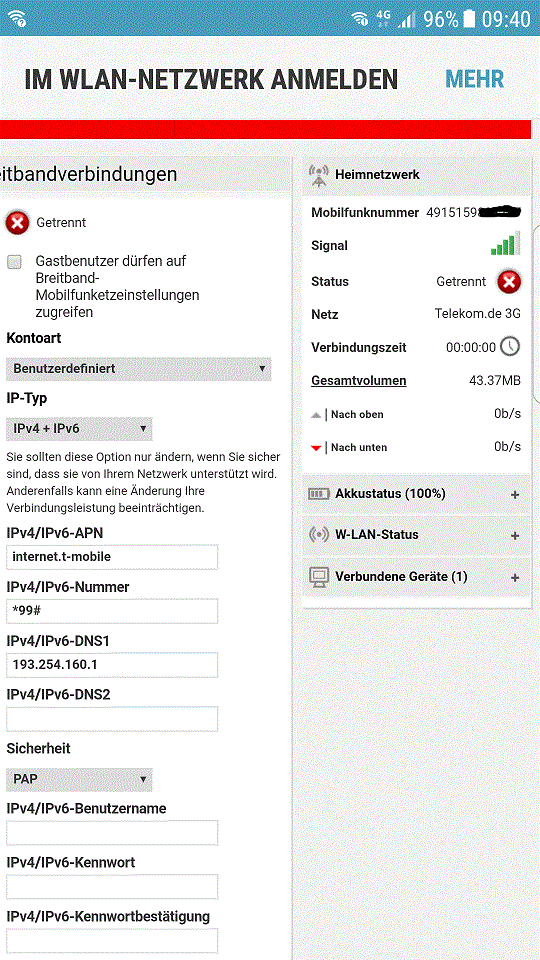 APN für Congstar etc ist alles eingestellt. Ich sehe nach Herstellen der Verbindung zu dem mobilen Router, daß Netz etc vorhanden ist,aber der Status getrennt.