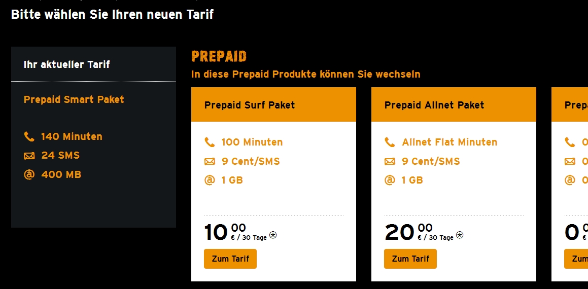 Nun bin ich einfach mal so in meincongstar auf "Tarif wechseln" gegangen, ohne da was zu machen. Da wird ja "Ihr aktueller Tarif" angezeigt, aber nicht mit 300 Min. + 50 SMS + 400 MB, sondern nur mit 140 Min. + 24 SMS +400 MB und da steht trotzdem "Prepaid Smart Paket".