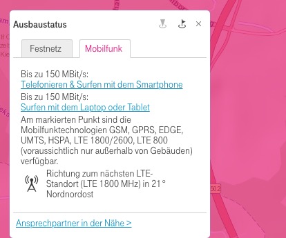 Die Karte unten gibt den aktuellen Netzausbau Stand hat Telekom für meinen Standort an. Nachmessungen mit der App der Netzagentur haben im Freien grossräumig um meinen Standort nur 2G mit sehr geringer Übertragungsrate ergeben.
