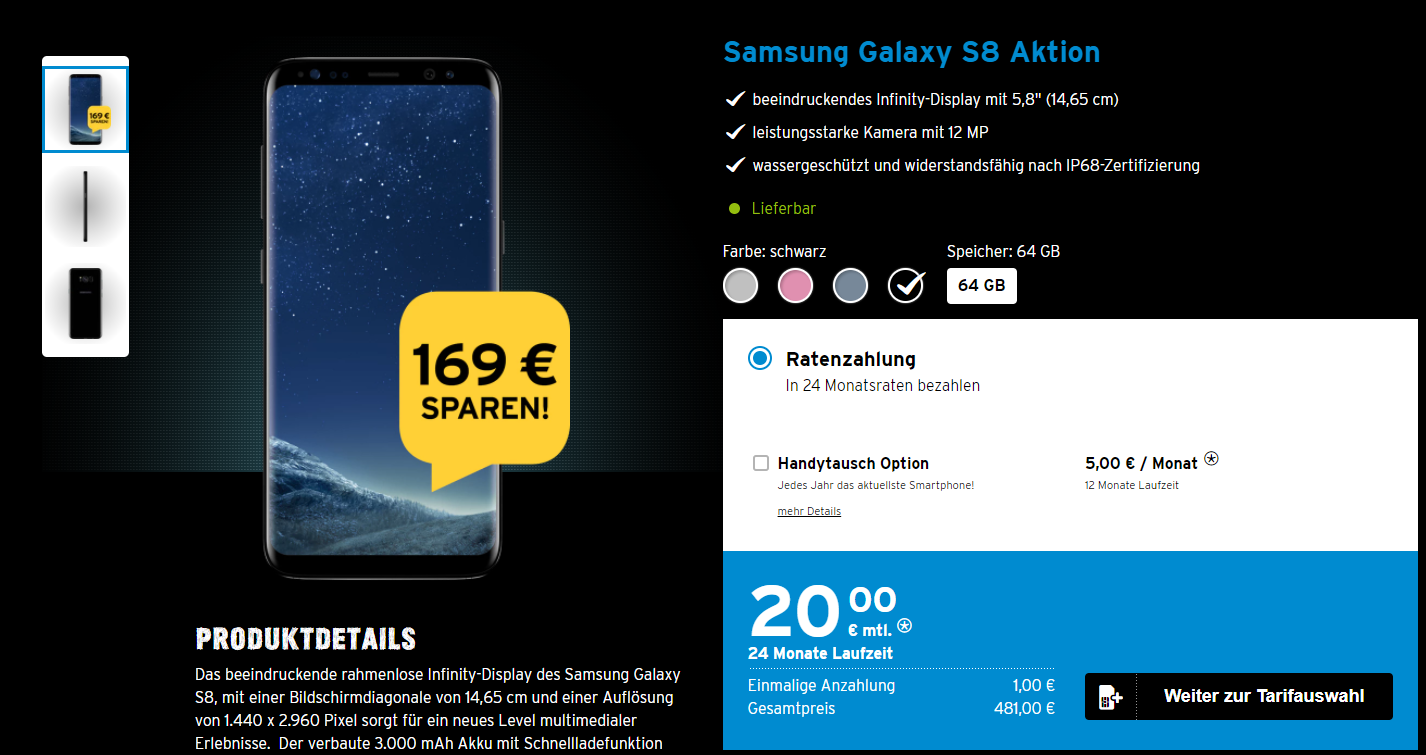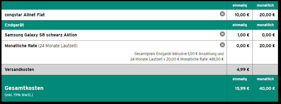 Bei dem Angebot für das Samsung S8 steht am Anfang es kostet 20€ pro Monat und kommt somit nach 24 Monaten auf 481€. Wenn ich die Bestellung durchgehe kommt am Ende aber raus dass die congstar Allnet flat 20€ und das Handy auch 20€ pro Monat kostet. Somit beinhaltet der Vertrag einen monatlichen Preis von 40€ für 24 Monate und man kommt am Ende auf über 900€ was weit entfernt vom Einzelpreis und unrealistisch ist. Wenn ich versuche die flat für 20€ aus der Bestellliste zu löschen entleert sich der gesamte Warenkorb.