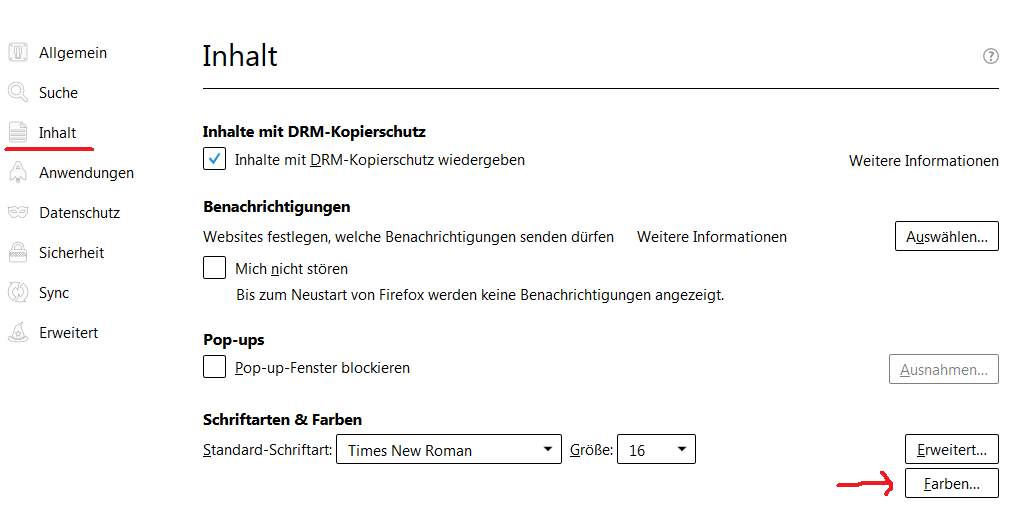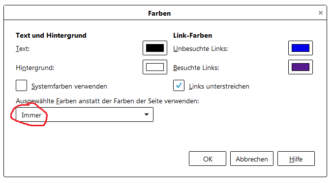 Ich hab mich noch mal ein bisschen auf die Suche gemacht und im Firefox habe ich grade tatsächlich die Möglichkeit gefunden, dass auch ohne Addon einzustellen:"Inhalt" anwählen und dort unter "Schriftart und Farben" auf "Farben" klicken: