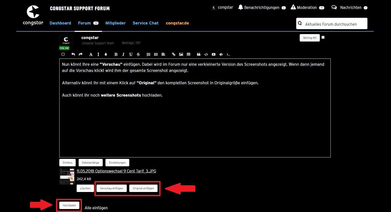 Nun könnt ihr euren Screenshot mit "Original einfügen" oder eine kleinere Version mit "Vorschau einfügen" einfügen:
