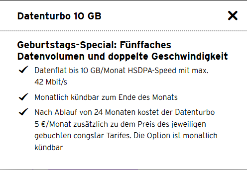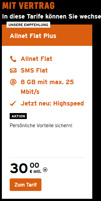 Also ich habe seit einiger Zeit den Tarif Allnet Flat Plus für 30 € mit dem Geburtstagsspezial 10 GB und Highspeed, nur bin ich seit kurzem umgezogen und musste zu meinem bedauern feststellen das ich hier in meiner jetzigen Örtlichkeit KEIN heighspeed habe,wenn überhaupt Edge.