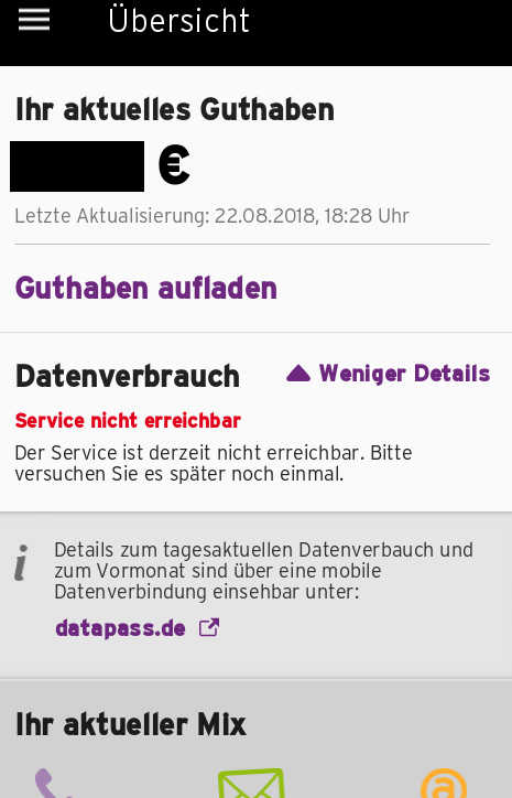 Leider kann ich meinen Datenverbrauch seit neuestem weder über die Congstar App, noch über Datapass abrufen.