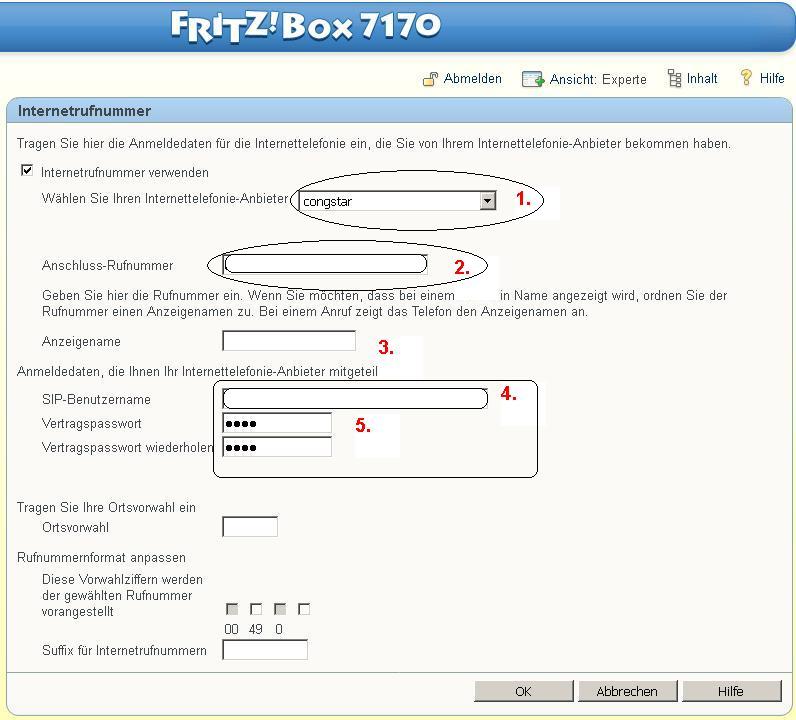 4. Die Rufnummer (Vorwahl+Nummer) >> Alter Eintrag ist "XXXXXXX@congstar.de = SIP-Benutzername