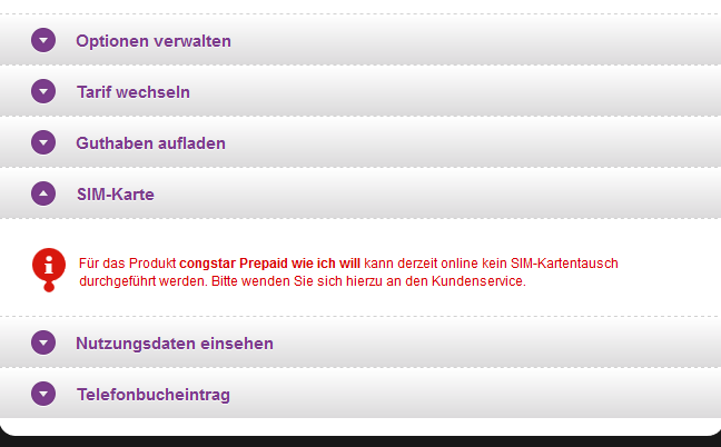 QuoteFür das Produkt congstar Prepaid wie ich will kann derzeit online kein SIM-Kartentausch durchgeführt werden. Bitte wenden Sie sich hierzu an den Kundenservice.